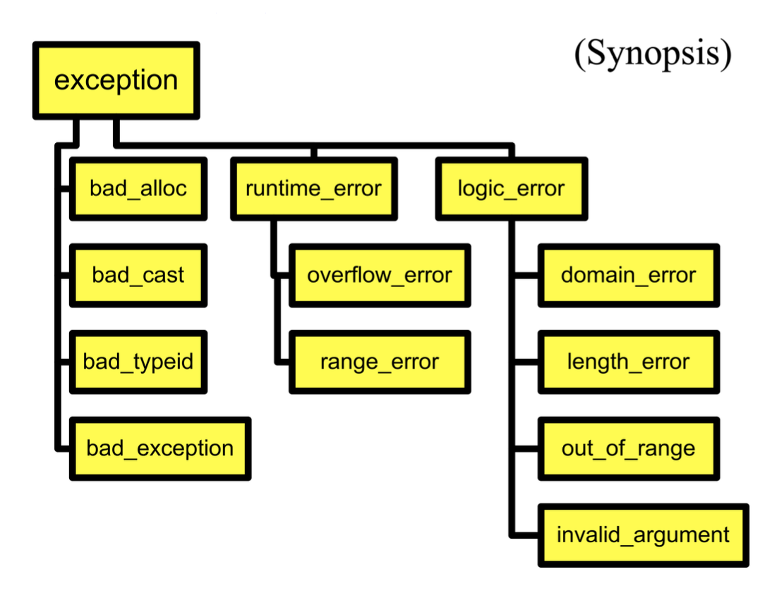 classMathErr{...virtualvoiddiagnostic();};classOverflowErr:publicMathErr{...}classUnderflowErr:publicMathErr{...}classZeroDivideErr:publicMathErr{...}// Using handlerstry{// code to exercise math optionsthrowUnderFlowErr();}catch(ZeroDivideErr&e){// handle zero divide case}catch(MathErr&e){// handle other math errors}catch(...){// any other exceptions}