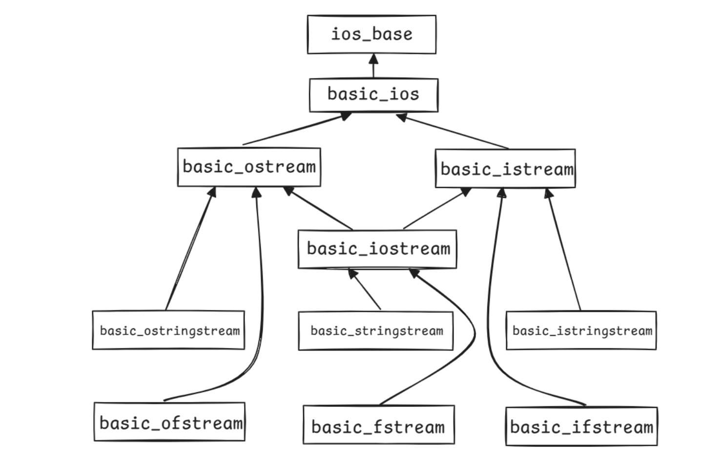basic_ostream(输出流基类):用于输出数据,如std::cout。basic_istream(输入流基类):用于输入数据,如std::cin。basic_iostream(输入输出流):同时支持输入和输出,继承自basic_istream和basic_ostream。