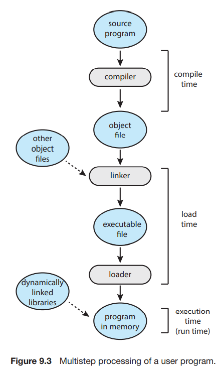 源程序中的地址通常是用符号表示(symbolic, 例如各种变量、函数名;汇编中的 label 等);编译器会将其绑定到 relocatable addresses,即相对于某一个段/模块等的偏移,例如 sp - 8, ds:[0];链接器或加载器(linker / loader)会将 relocatable addresses 绑定到 absolute addresses。当然,如果编译器在编译时就知道程序所处的内存地址,则会生成 absolute code。