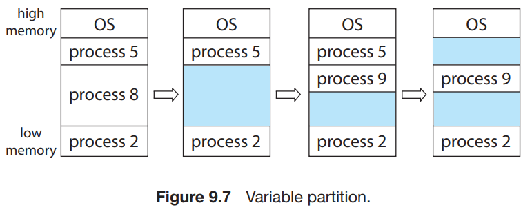 很可能在进行一段时间的运行后,空闲内存空间被分为大量的 hole,它们总体加起来可以满足进程要求,但它们并不连续,每一个小的 hole 都不可以被利用。我们称这种问题为 External Fragmentation,因为这些不可用内存是分布在 partition 之外的。