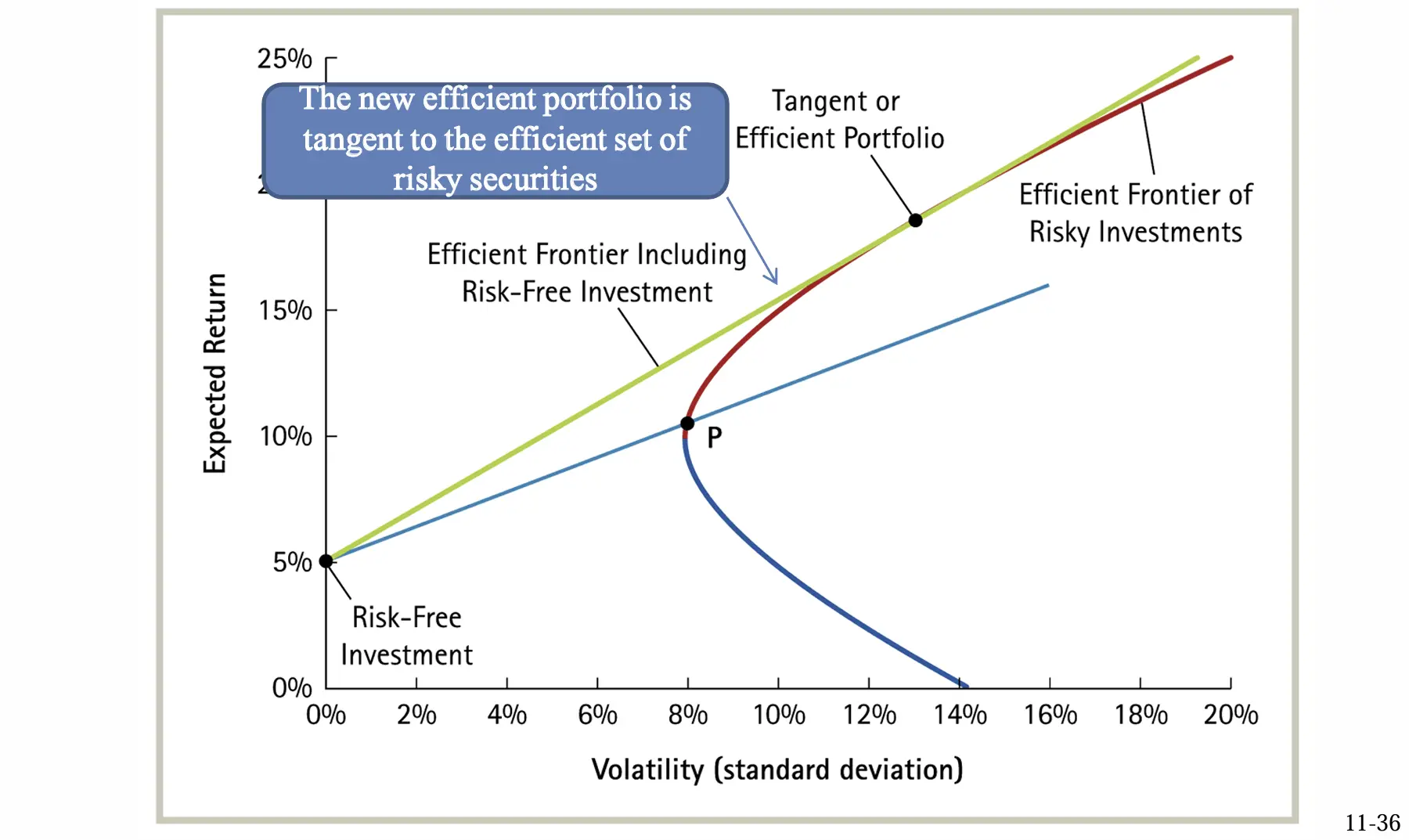 - 引入一个不需要风险的投资(比如短期国债),相当于在 risk = 0 轴上有一个点,这个点可以和风险投资进行组合: